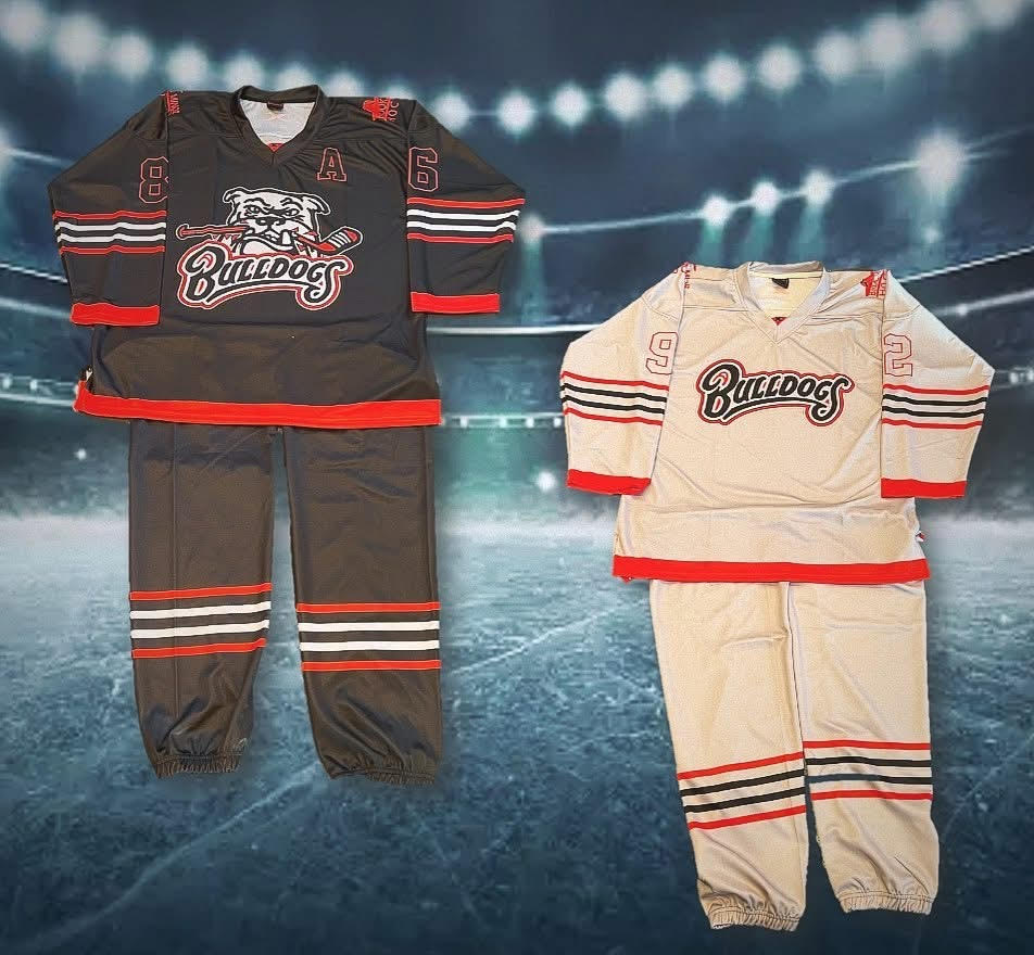 Contact us for a quotation on your team’s or association’s custom jersey order. Fully Sublimated Hockey Jerseys, 100% custom designs. Matching sublimated hockey socks and pant shells also available. Made in a strong durable and light weight fabric, designed for the sport. Here are samples of our hockey uniform designs: